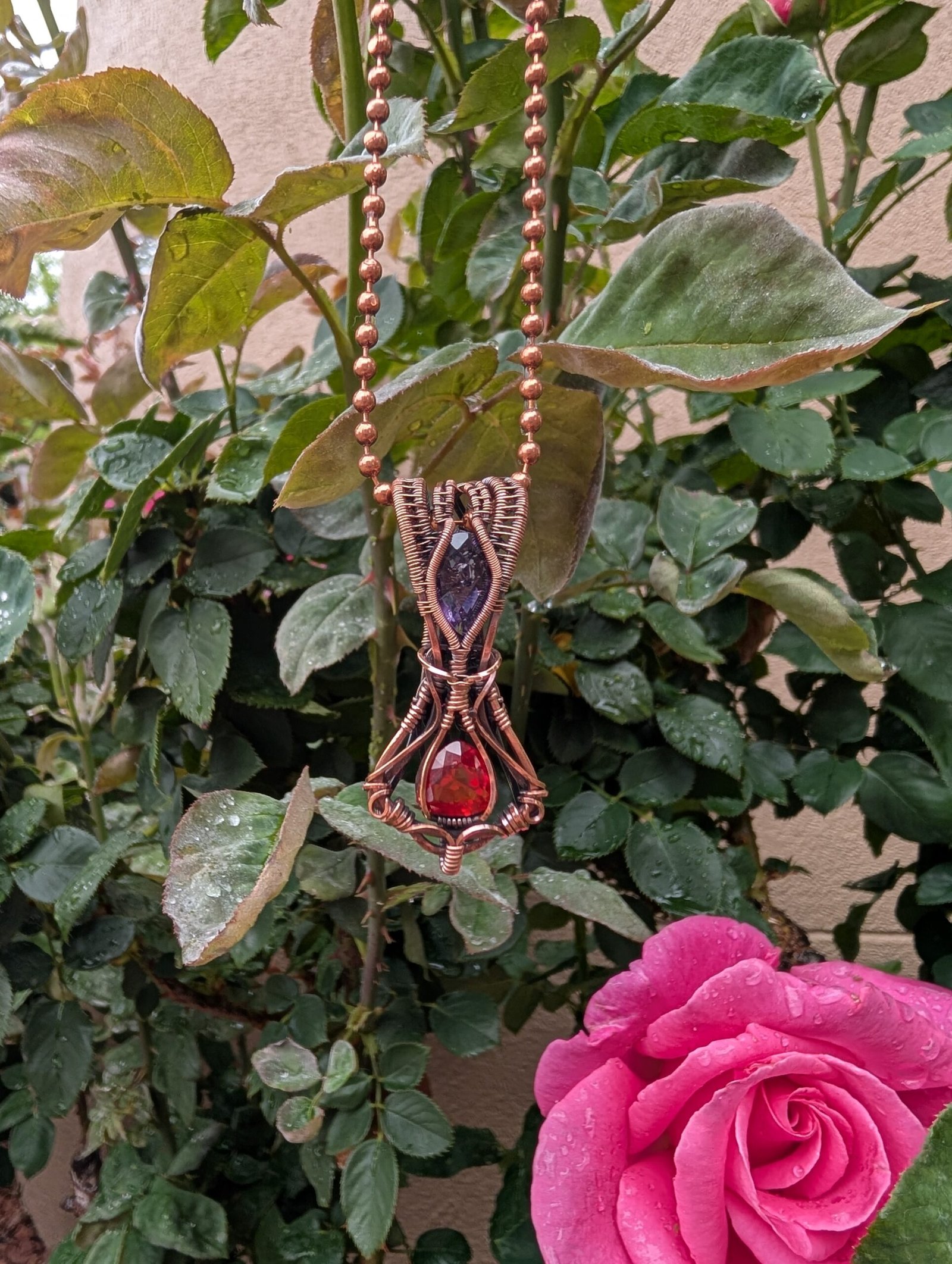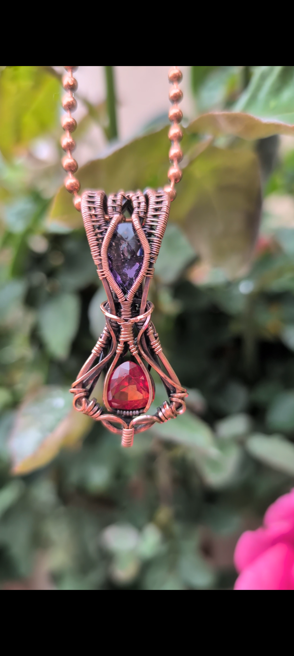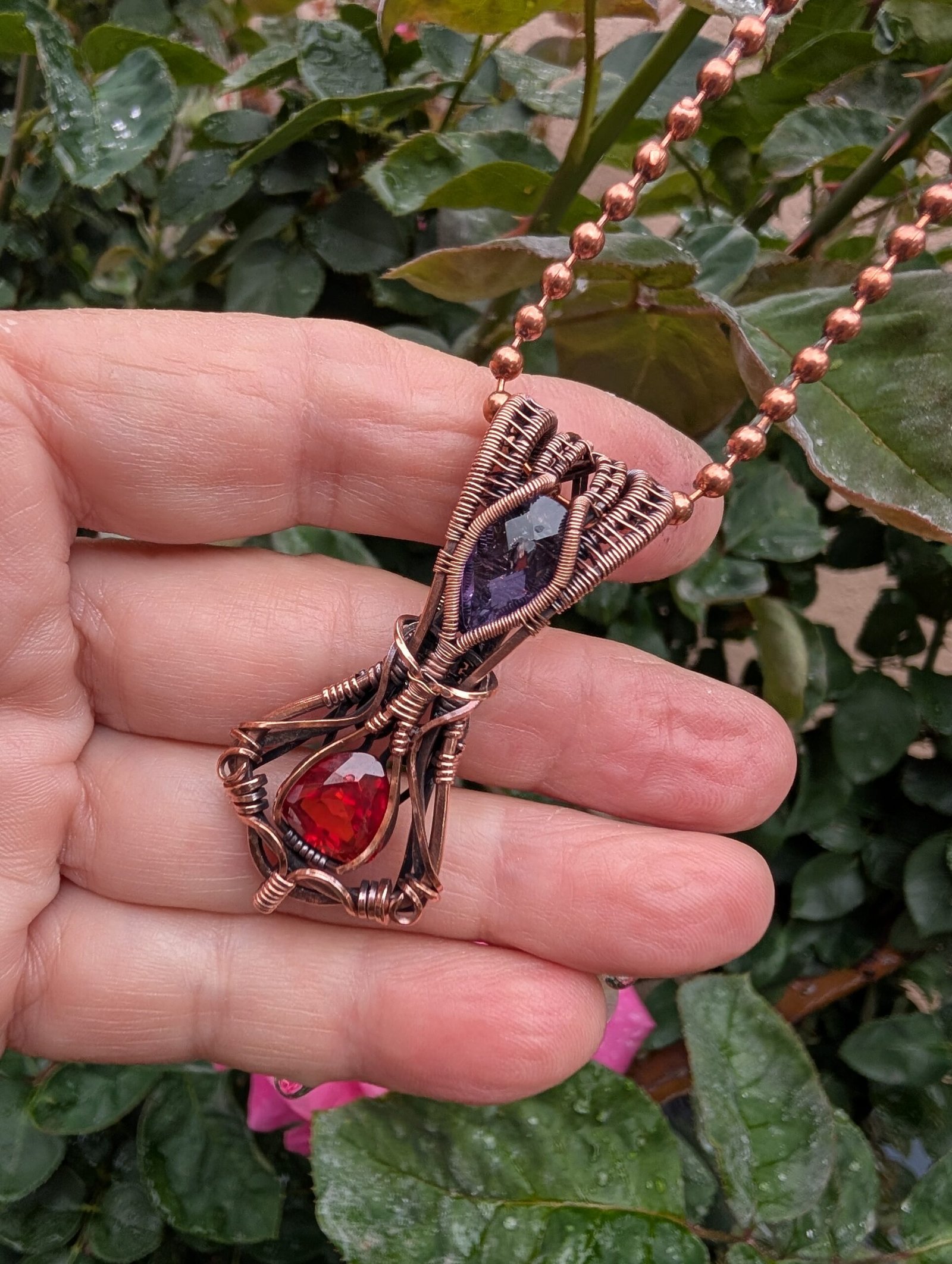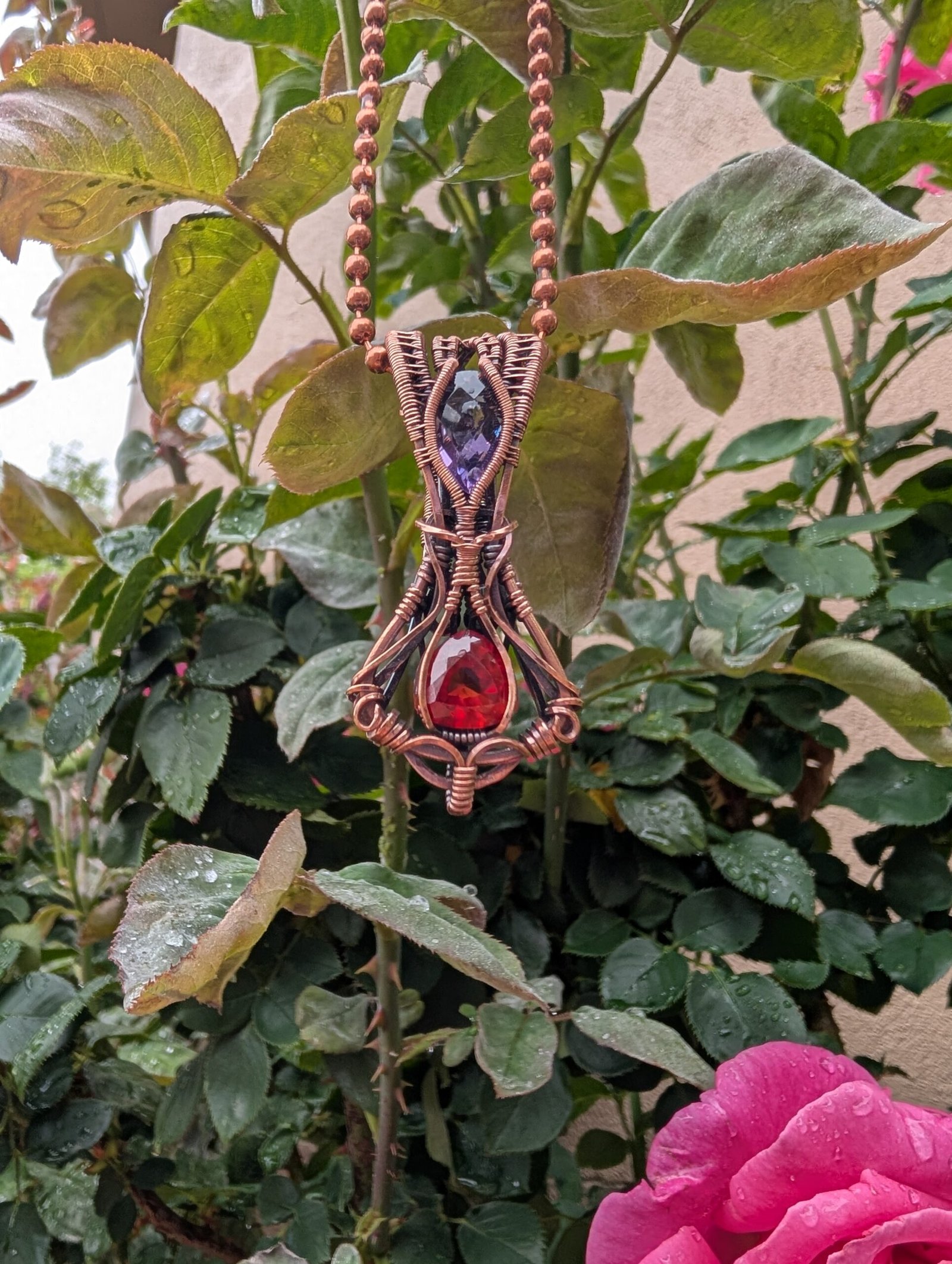 ~~Behold a treasure imbued with ancient energies – a mesmerizing spessartine garnet, its fiery glow reminiscent of desert sunsets 🔶💫 and hidden knowledge, with its vibrant orange a testament to life’s fiery beauty, is paired with the enchanting violet of amethyst. These special gems are said to enhance psychic abilities and connect you to higher realms. The copper wrapping, like time-worn runes, amplifies these mystical properties, creating a powerful conduit for inner vision and profound understanding. Wear this pendant and unlock the whispers of your own inner oracle. This ‘truly’ a 1-of-a-kind DD Lynn Designs pendant exudes a mystical charm that draws the eye and stirs the soul. Let its radiant energy and harmonious blend of gemstones infuse your days with magic and wonder.