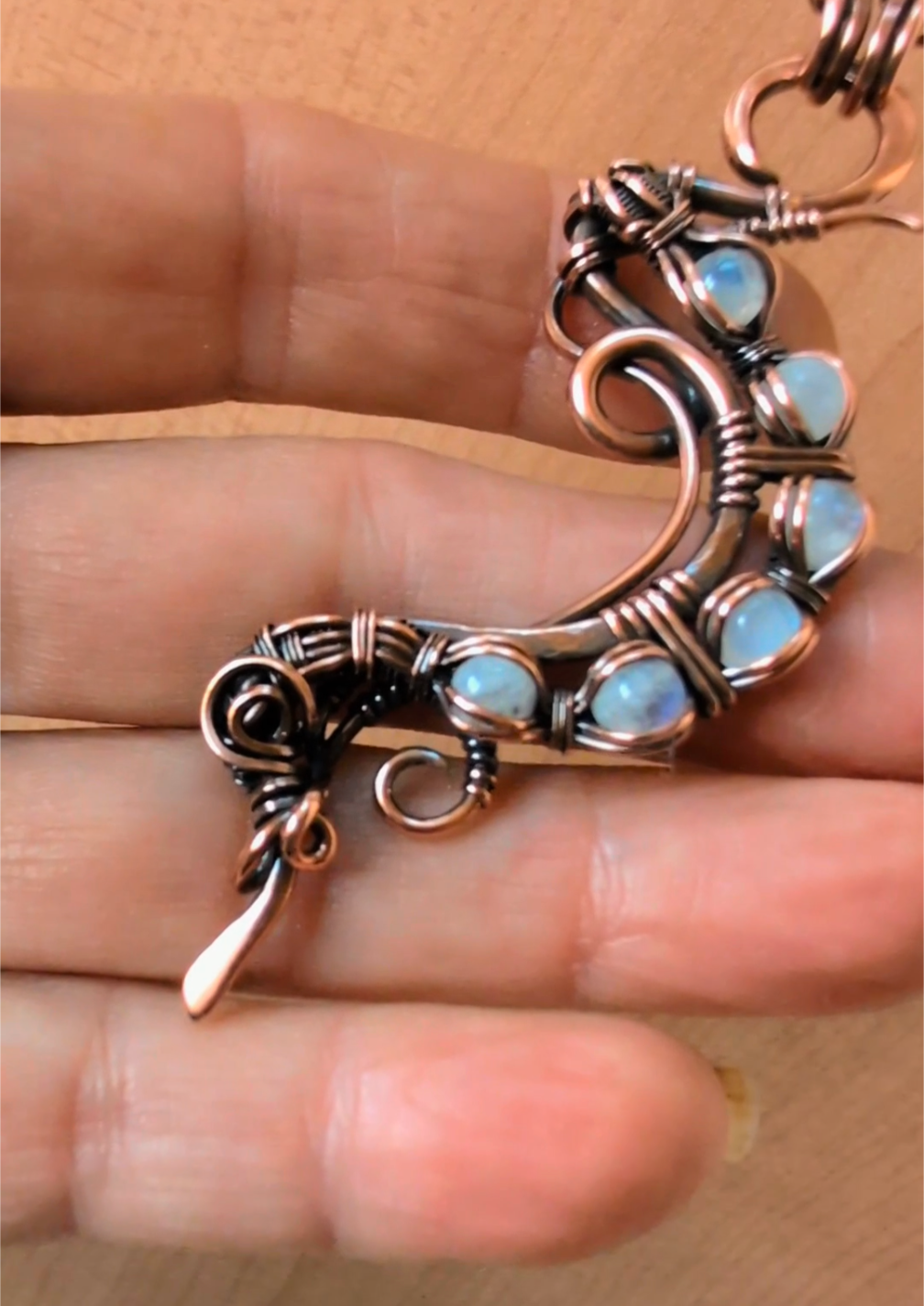 The copper, a conduit of earthly and otherworldly power, embraces these lunar fragments with a loving, swirling embrace. It is as if the very essence of twilight has been spun into delicate tendrils, cradling the stones and amplifying their gentle magic. Wear this piece, and feel the intuitive tides within you awaken, your spirit attuned to the subtle whispers of dreams and the luminous wisdom held within the shadows.